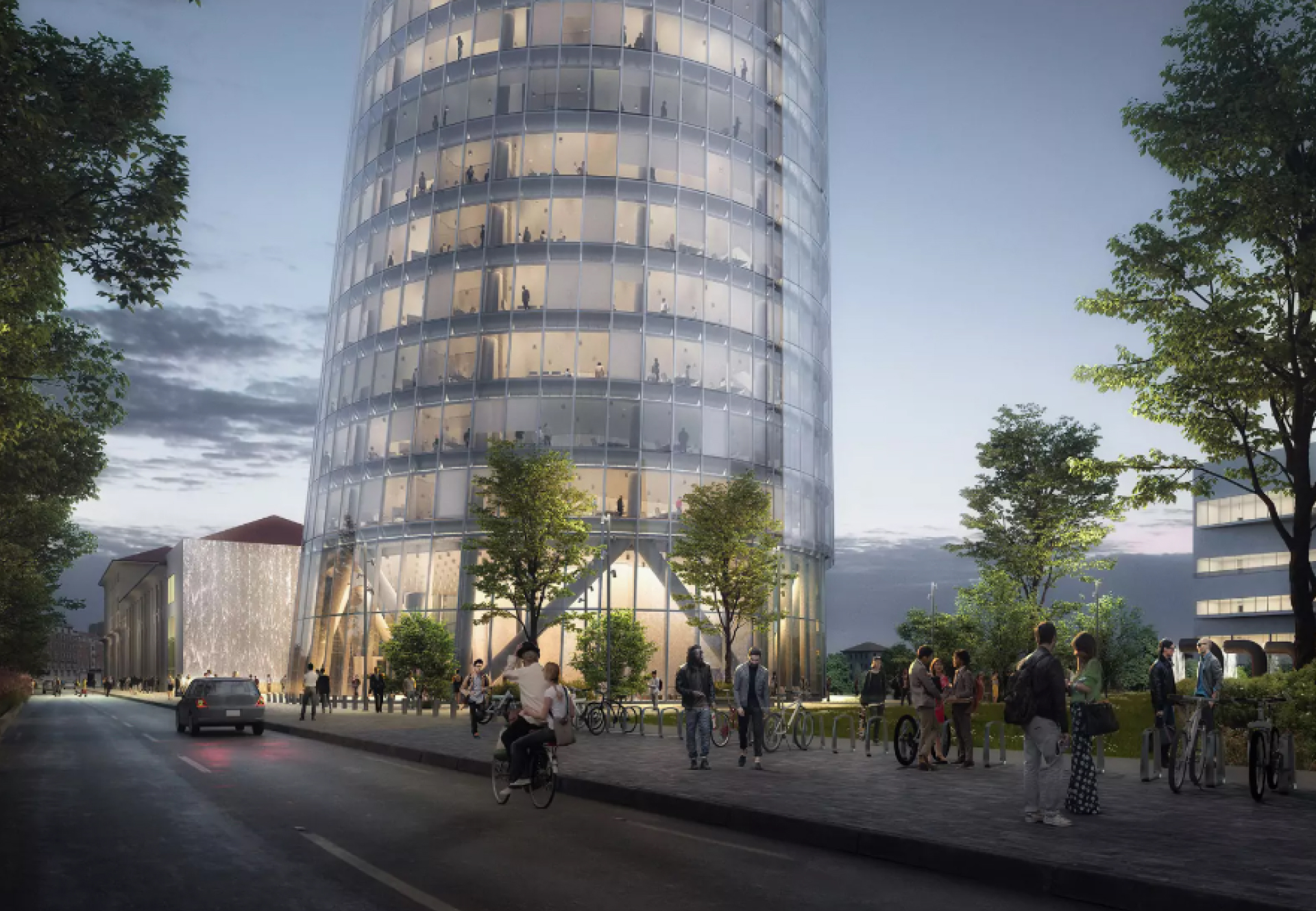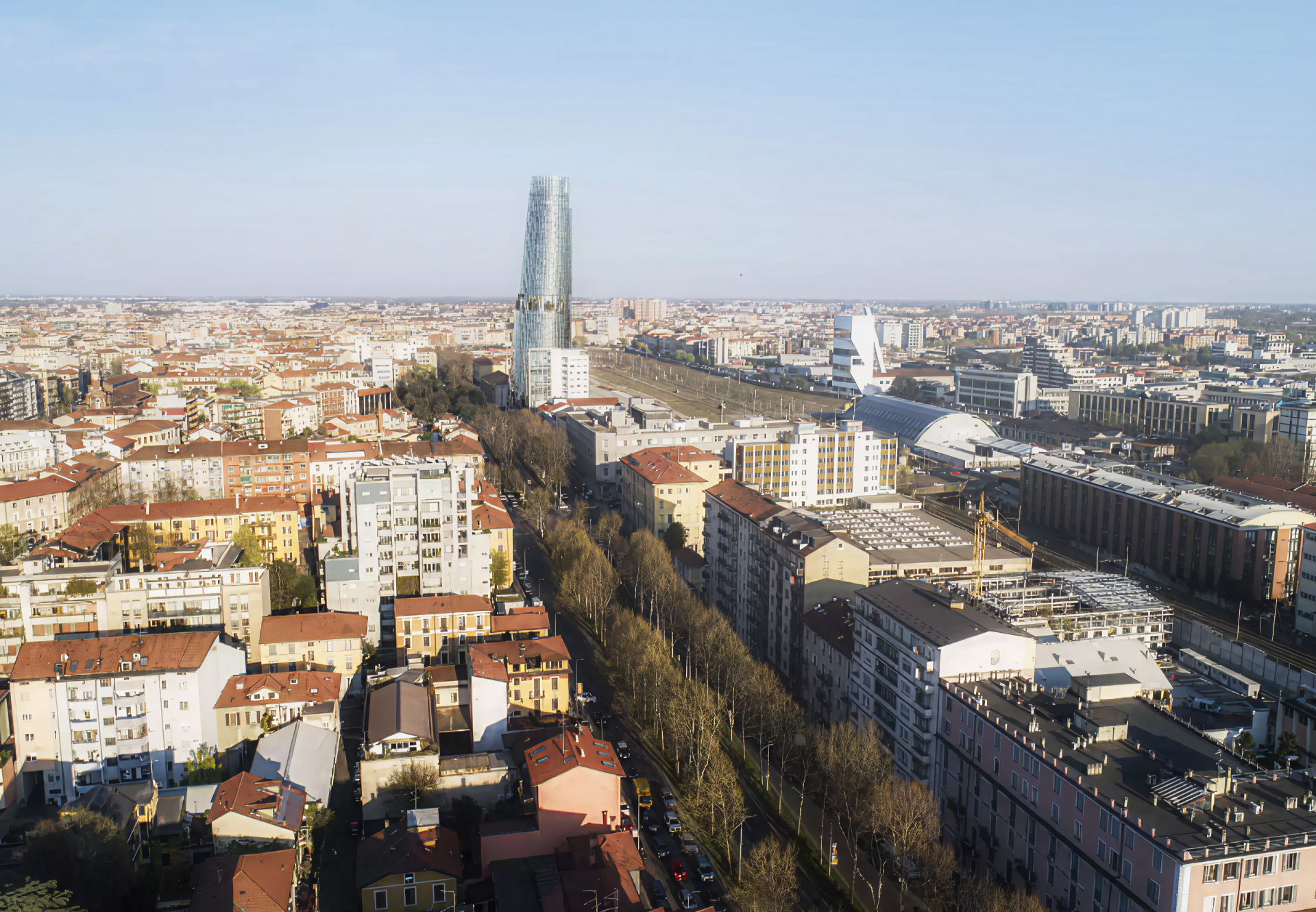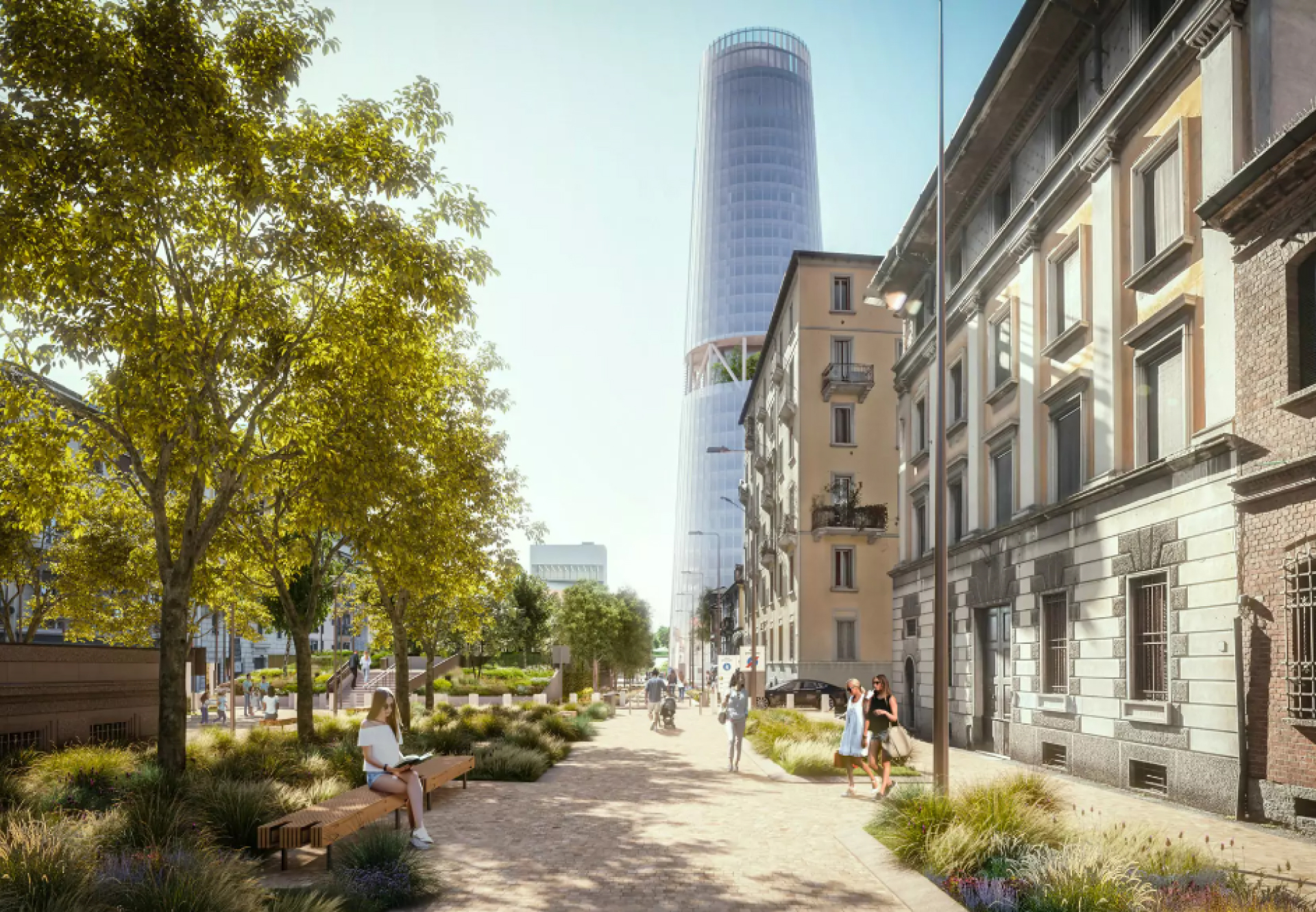Complementing these are two newly constructed buildings, named “the Tower” and “the Stecca”, which together define the complex’s new architectural identity. The Tower, the project’s iconic element, features a circular footprint and a tapered profile, reaching a height of 144.45 meters with an elegant truncated-cone form.