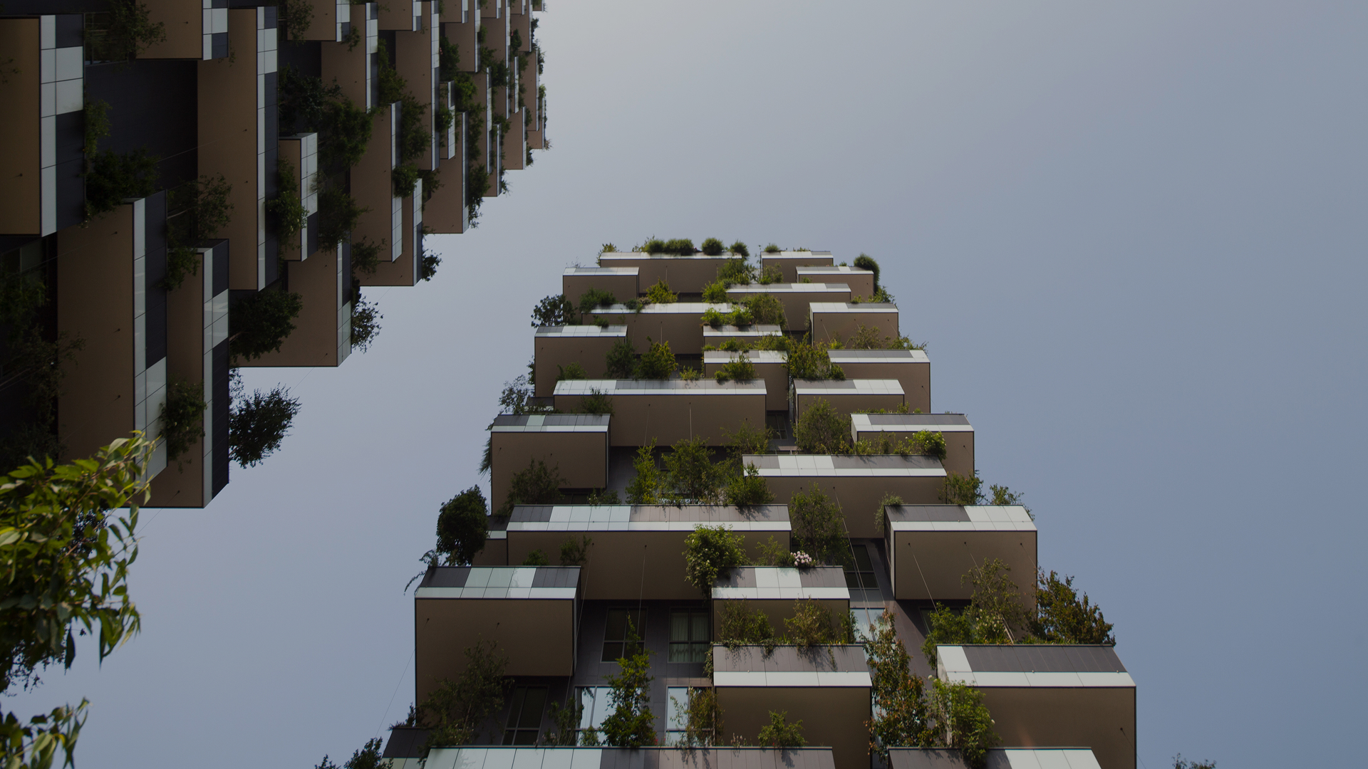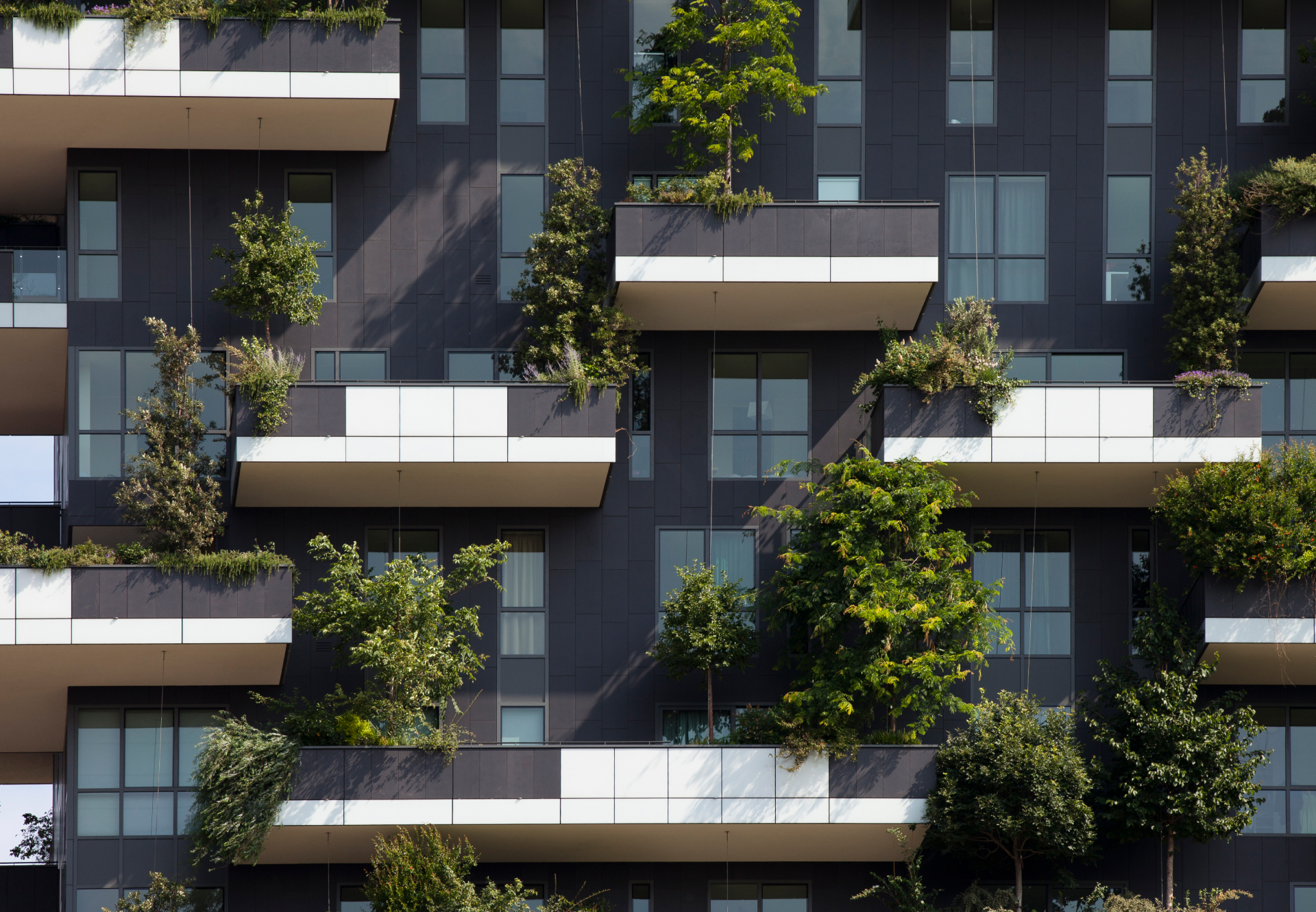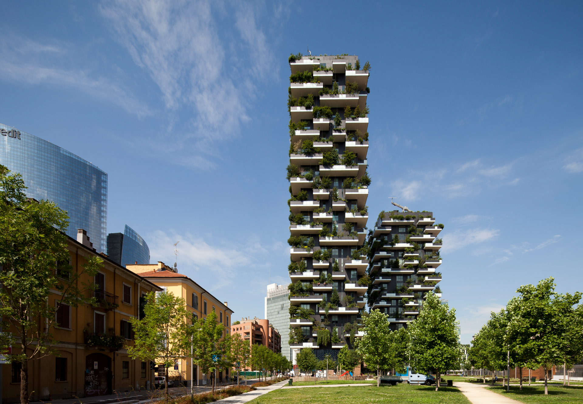 The residential towers, designed by Boeri Studio and identified as Towers D and E, rise 26 and 18 stories above ground (112 m and 80 m respectively) and contain 111 apartments. The residential floors are organized around shared entrances, common areas, and technical spaces, with terraces hosting mature trees and shrubs arranged according to orientation and height. Vegetation is an integral part of the architectural design: trees and plants are placed in large planters integrated into the cantilevered balconies, staggered vertically to ensure optimal sunlight, canopy growth, and visual continuity with the surrounding urban park. The reinforced concrete structure features perimeter cores housing stairs and elevators to maximize natural daylight exposure. A centralized irrigation system and dedicated maintenance team manage the green infrastructure.