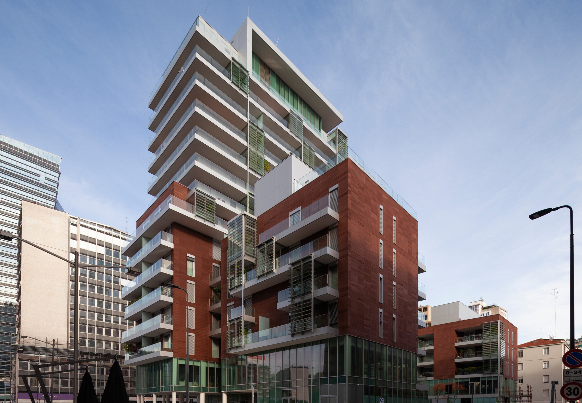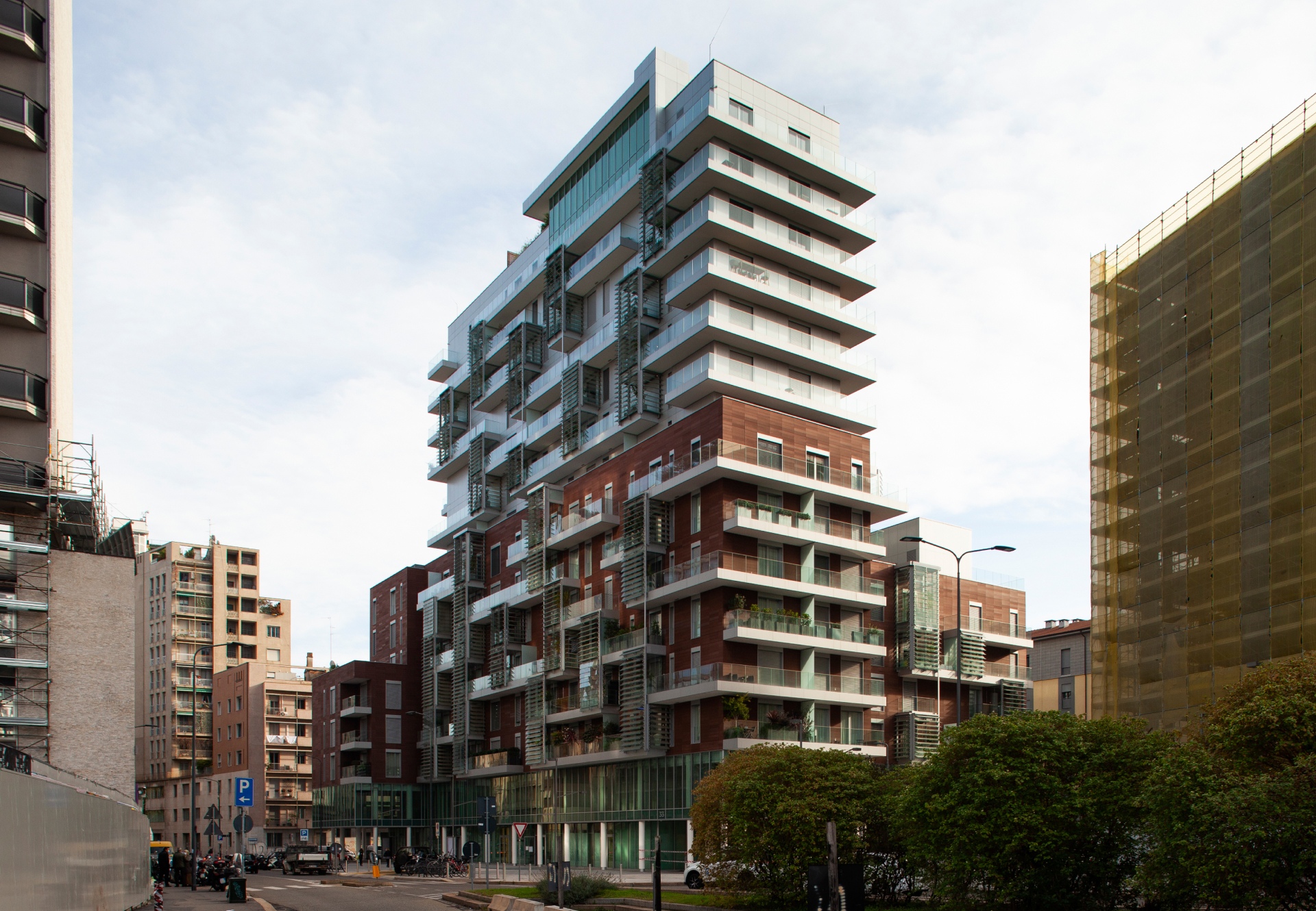 The development rises sixteen stories above ground, reaching its maximum height at the sixteenth floor, and extends six levels underground. The basement areas, with a total surface of 21,000 sqm, accommodate parking facilities, storage areas, technical rooms, and a wellness center. The above-ground volume, shaped like a “C”, has a built area of 17,000 sqm. The ground floor hosts retail units and restaurants, while the upper floors contain 91 residential units of varying sizes, all featuring large terraces and private winter gardens.