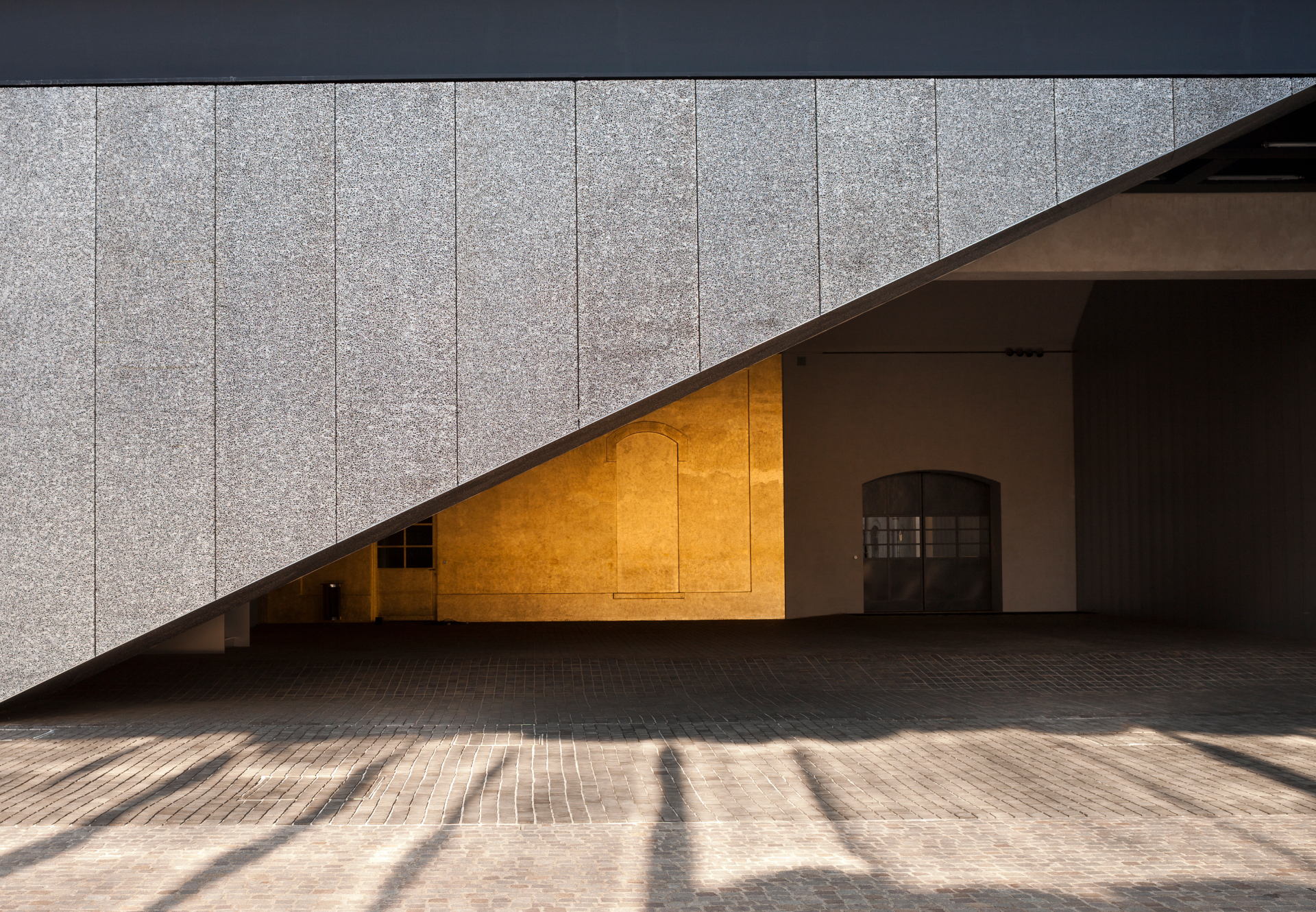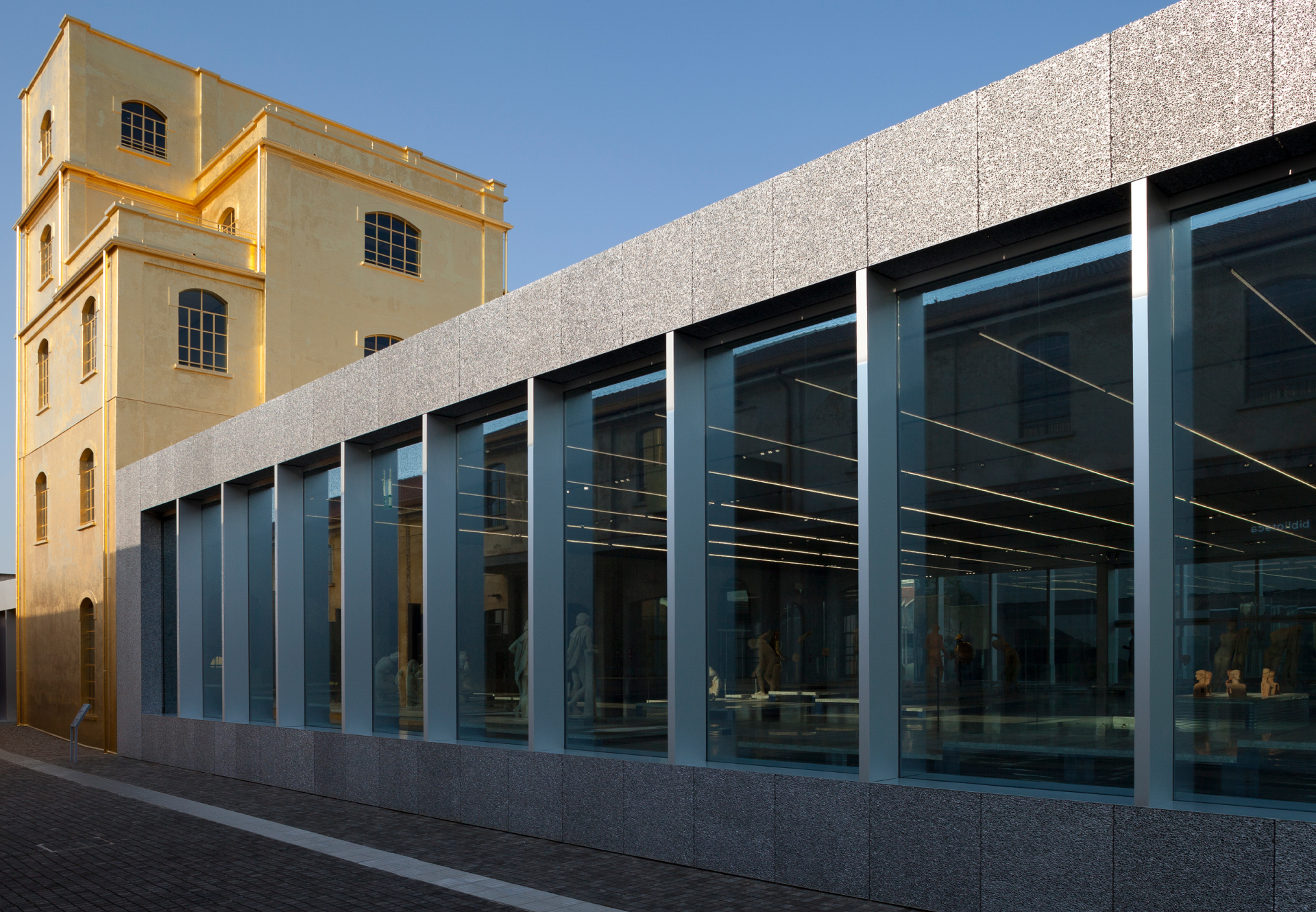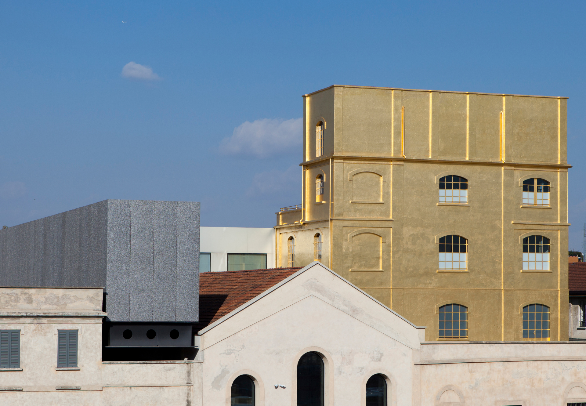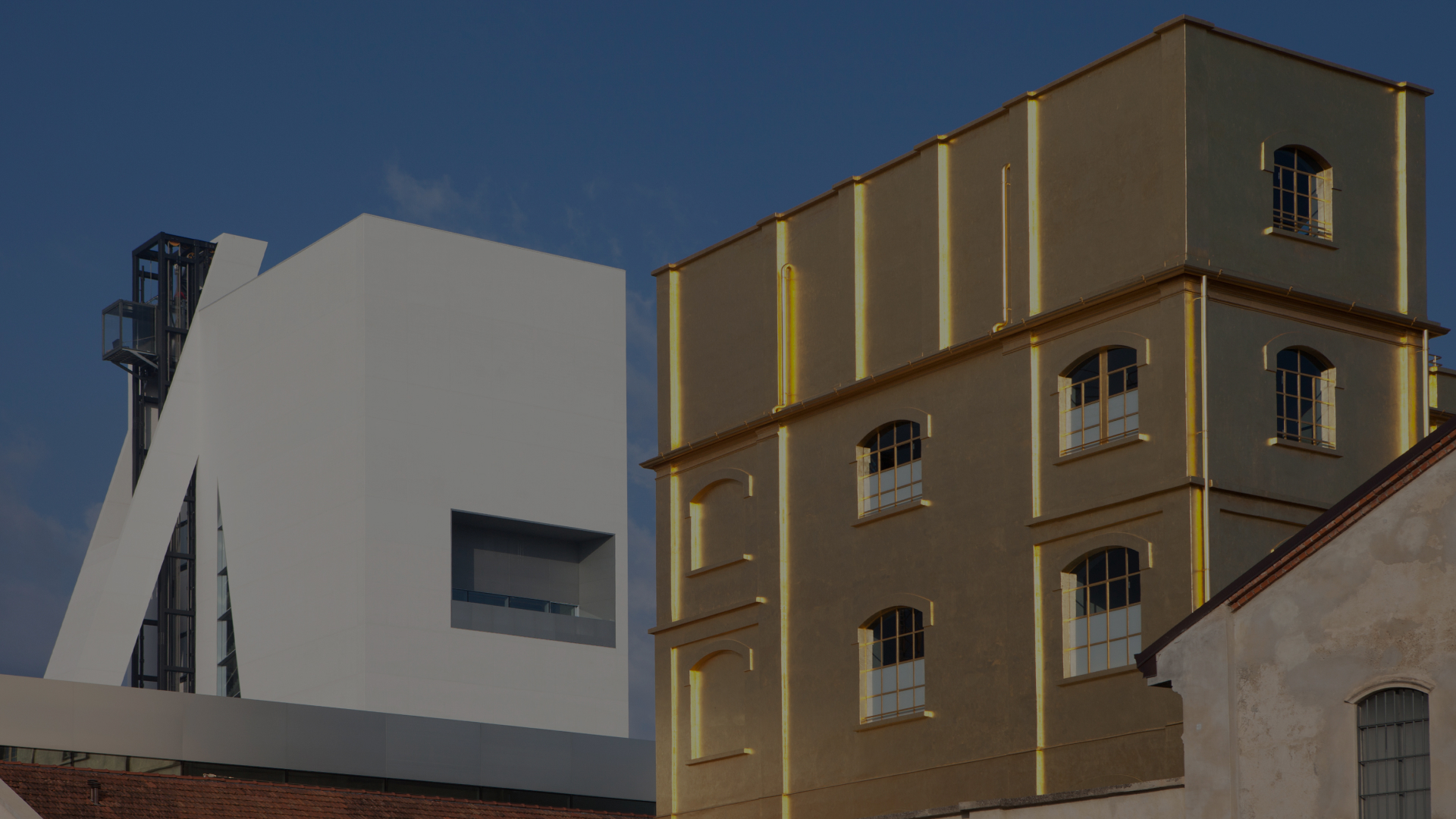 Completed in 2018, the Tower is a 60-meter-tall vertical exhibition structure in exposed white cast-in-place concrete, featuring nine above-ground levels and a panoramic rooftop, characterized by variable floor plans and increasing ceiling heights. The Podium, serving as the core circulation hub of the campus, is a double-height transparent volume with no internal columns, topped by an opaque gallery designed for high environmental performance. Among the restored buildings, the Haunted House stands out — a historic tower entirely clad in 24-karat gold leaf applied over pigmented plaster, using traditional gilding techniques.