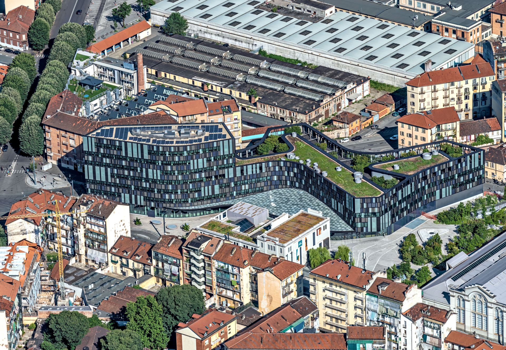The main building, with its fluid form inspired by a “cloud”, occupies an entire city block and interacts with the existing structures converted to new functions: the Lavazza Museum, the former Enel power station, the IAAD headquarters, and spaces for events and dining. The project also includes a new public square, pedestrian paths, green areas, and the restoration and enhancement of an early Christian archaeological site.