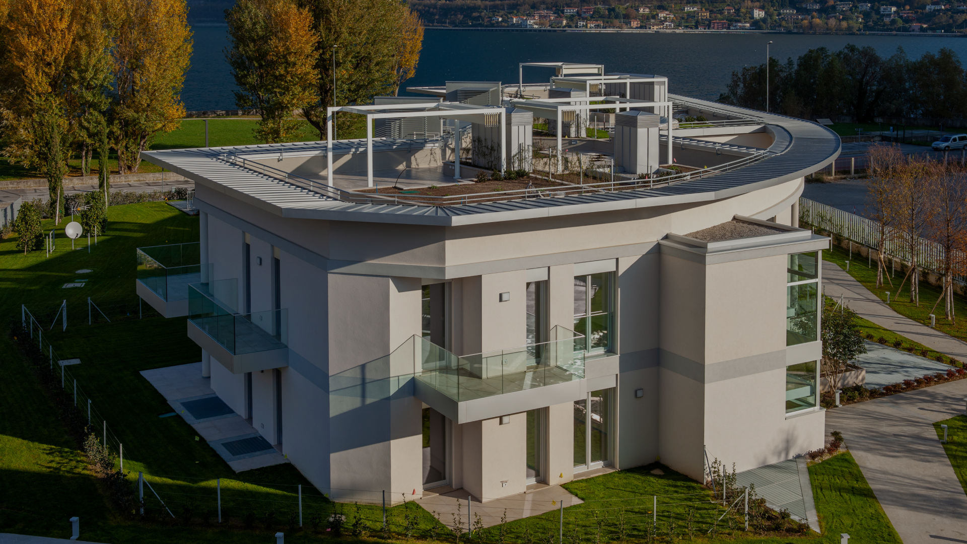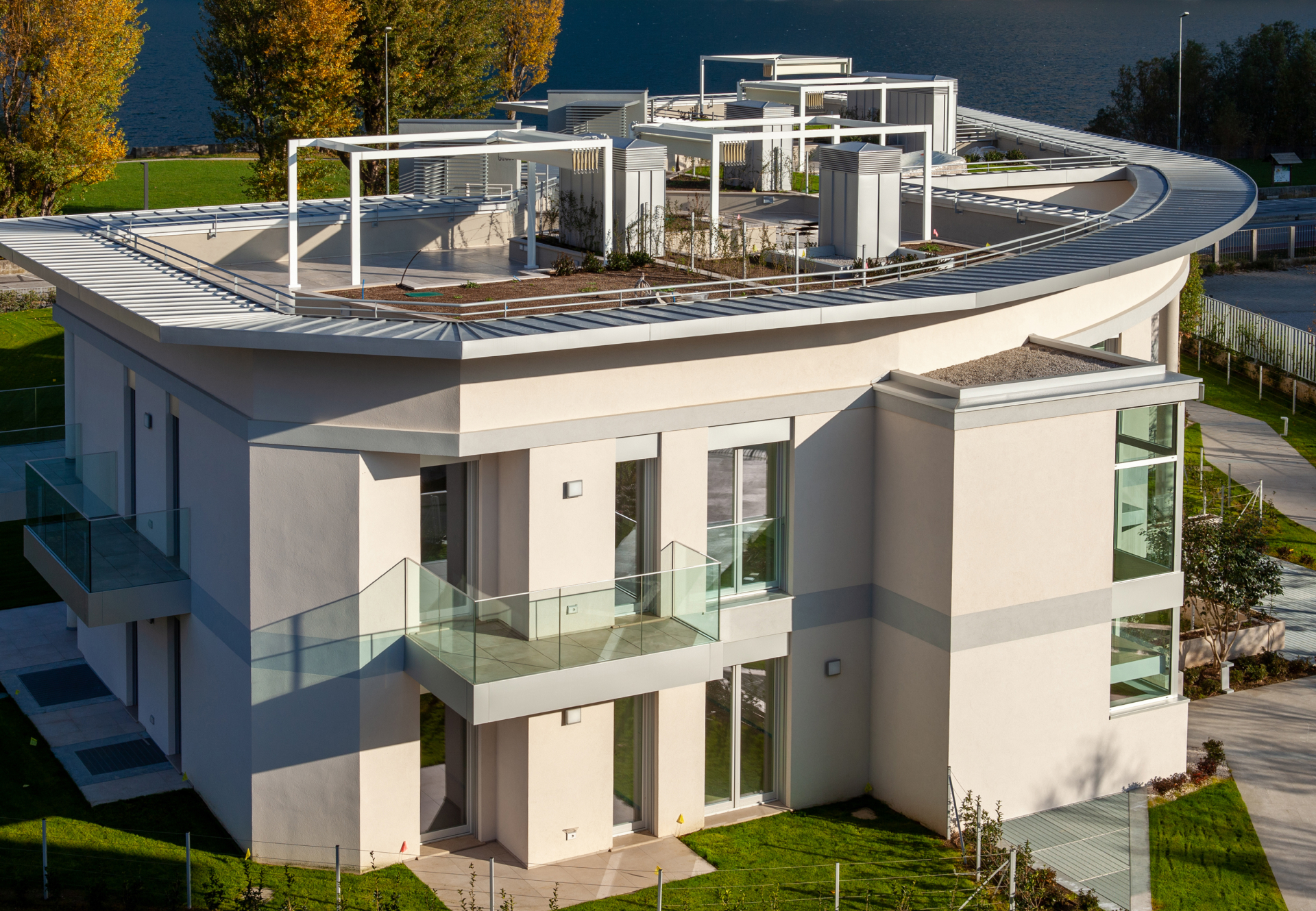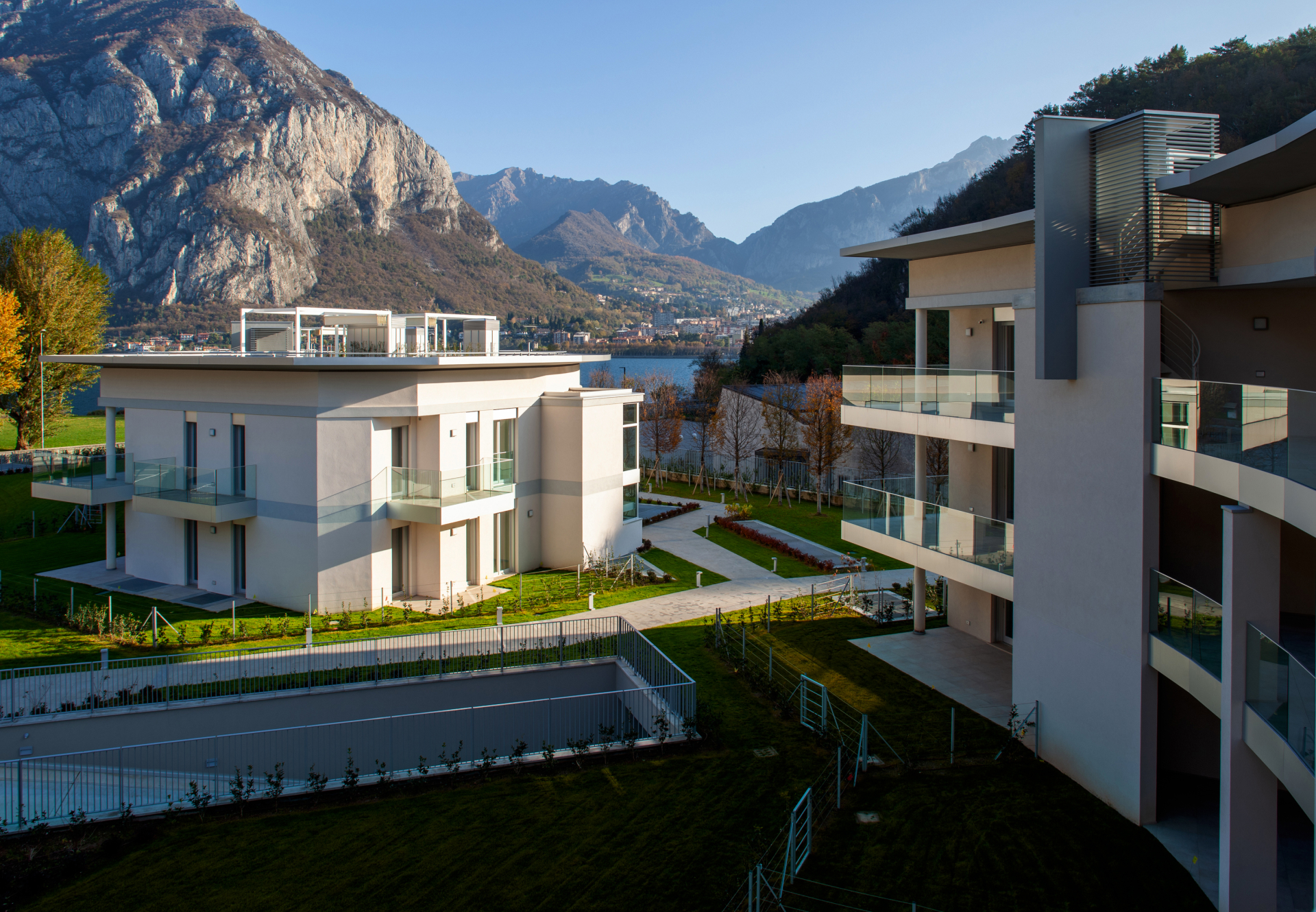 Il progetto si è distinto per l’organizzazione spaziale degli edifici e delle singole unità abitative, studiata per valorizzare le viste verso il lago e garantire la riservatezza degli ampi terrazzi, posizionati con attenzione all’orientamento e ai rapporti visivi tra le unità. Gli appartamenti, distribuiti in varie tipologie e metrature, presentano soluzioni funzionali moderne e finiture di alto livello. Le unità al piano attico dispongono di accesso diretto a giardini pensili privati in copertura.