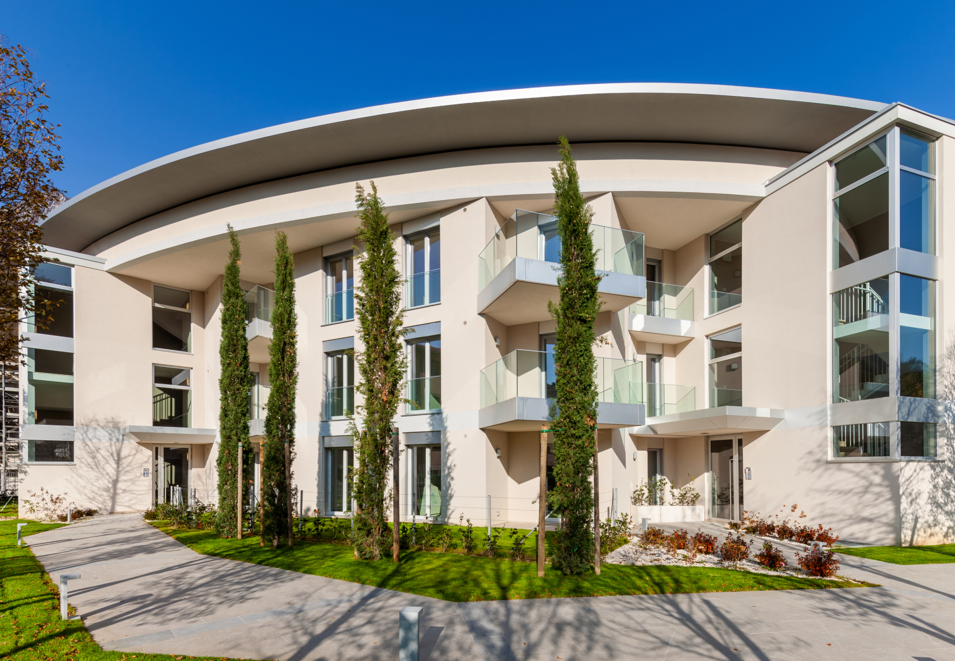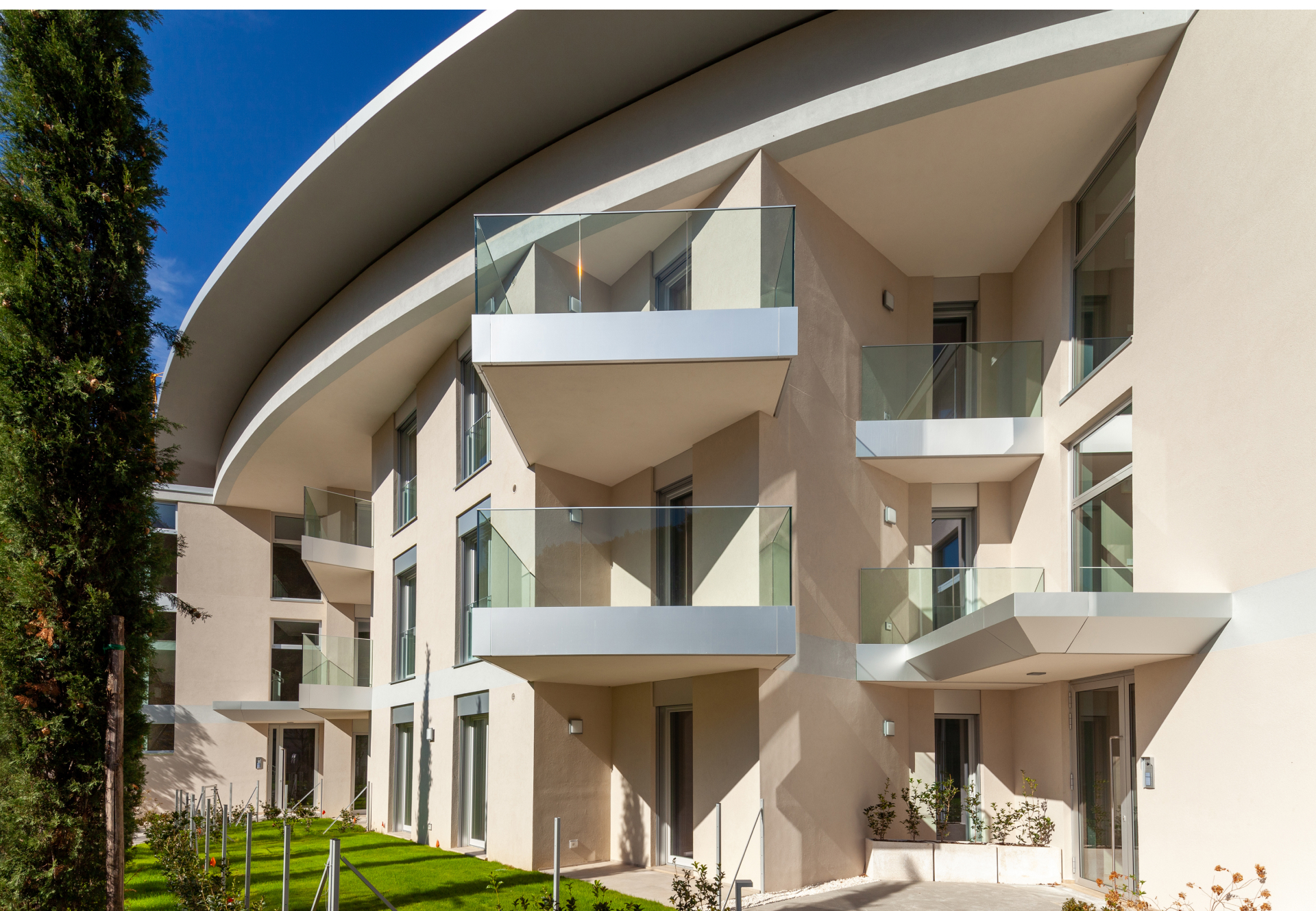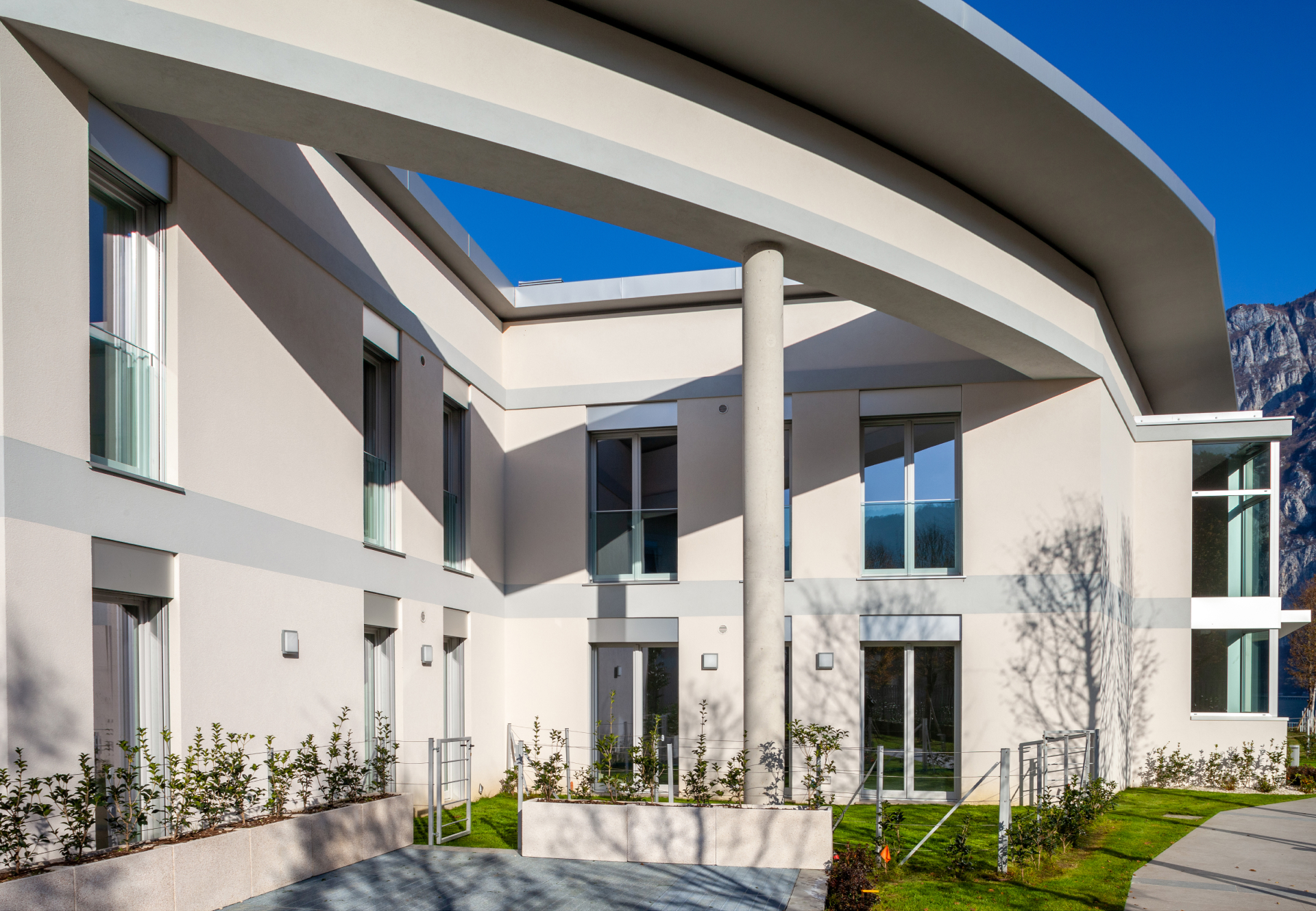 Il progetto si è distinto per l’organizzazione spaziale degli edifici e delle singole unità abitative, studiata per valorizzare le viste verso il lago e garantire la riservatezza degli ampi terrazzi, posizionati con attenzione all’orientamento e ai rapporti visivi tra le unità. Gli appartamenti, distribuiti in varie tipologie e metrature, presentano soluzioni funzionali moderne e finiture di alto livello. Le unità al piano attico dispongono di accesso diretto a giardini pensili privati in copertura.