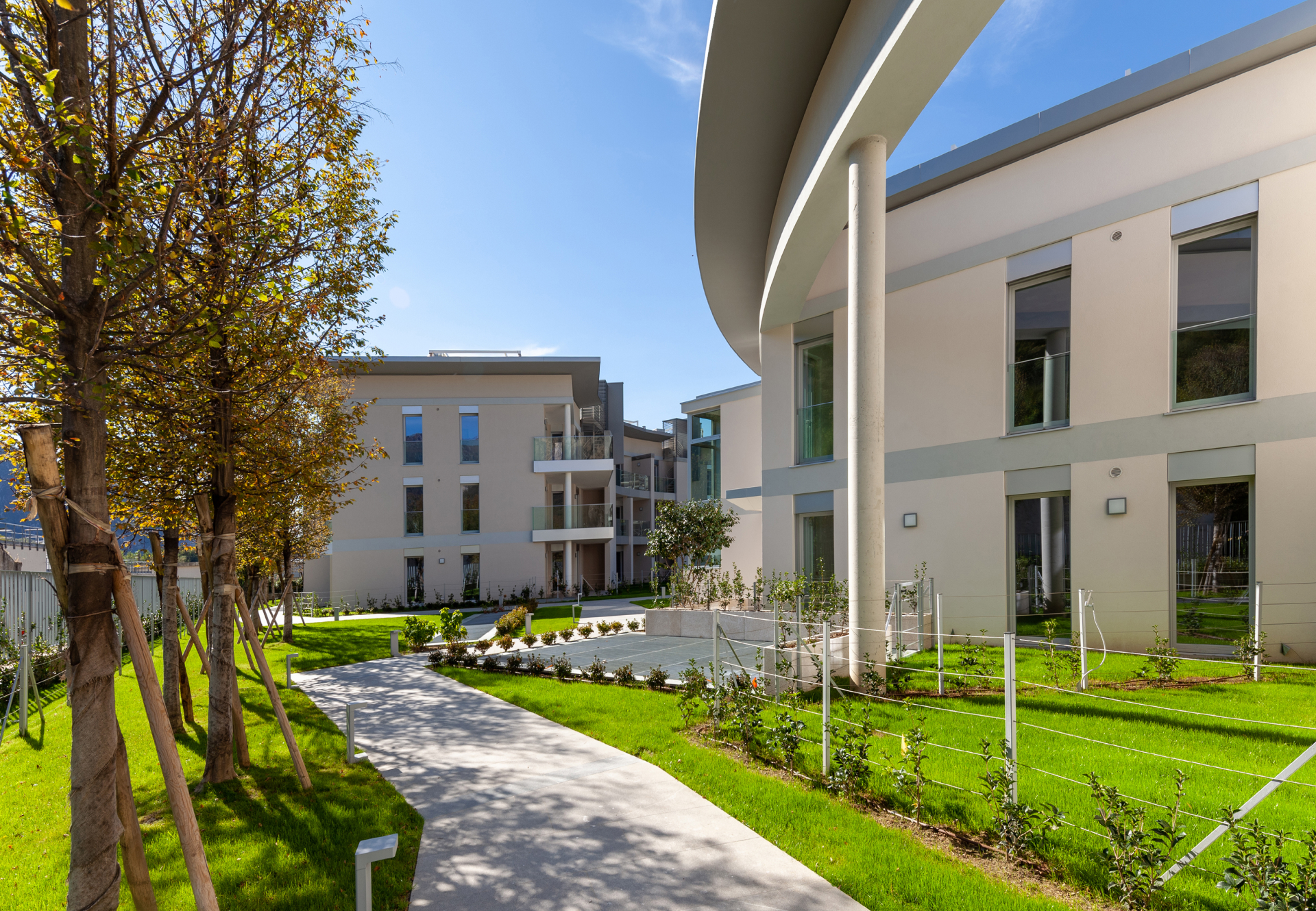 Le prestazioni energetiche degli edifici si collocano in classe A e sono supportate da sistemi impiantistici avanzati e tecnologie integrate: impianti domotici, climatizzazione ad alta efficienza e dispositivi di sicurezza interni ed esterni. L’intervento si completa con un’ampia area verde condominiale centrale, che favorisce l’integrazione paesaggistica del complesso nel contesto naturale circostante.